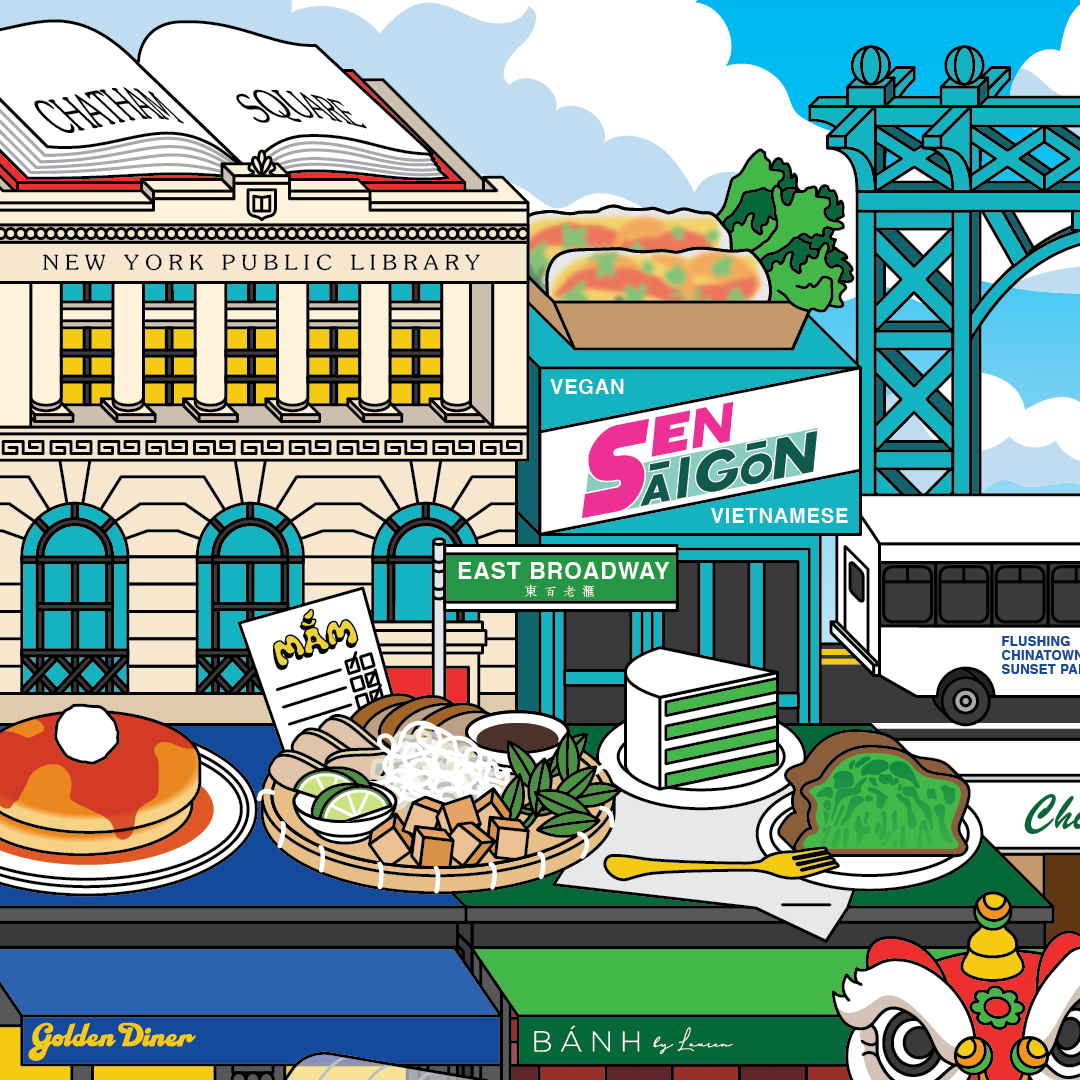 I also drew inspiration from my own childhood memories — riding the van from Flushing (where I grew up) to Chinatown, buying lychee at the fruit stalls on Mulberry Street, getting a bag of 鷄蛋仔 (HK egg waffles) from the street cart, picking out my first pair of glasses, and following the lion dancers as they moved through the streets on Lunar New Year, blessing storefronts with good luck.